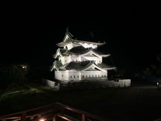 津軽藩 10 万石の居城。元々 5 層 6 階の天守が本丸南西にあったものの落雷で焼失し、現在は「本丸未申櫓跡」として天守台のみが残る。現在「天守」と称される層塔型の御三階櫓は 1810 年築。御三階櫓は堀側と本丸側で外観が異なり、本丸側には破風のような装飾物が設けられていない。