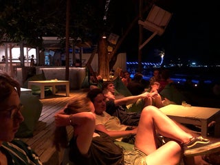 Awesome bean bag chairs right on the beachfront to watch the sunset from! Drinks and food seem reasonably priced. Happy hour gives you 20B off most drinks.